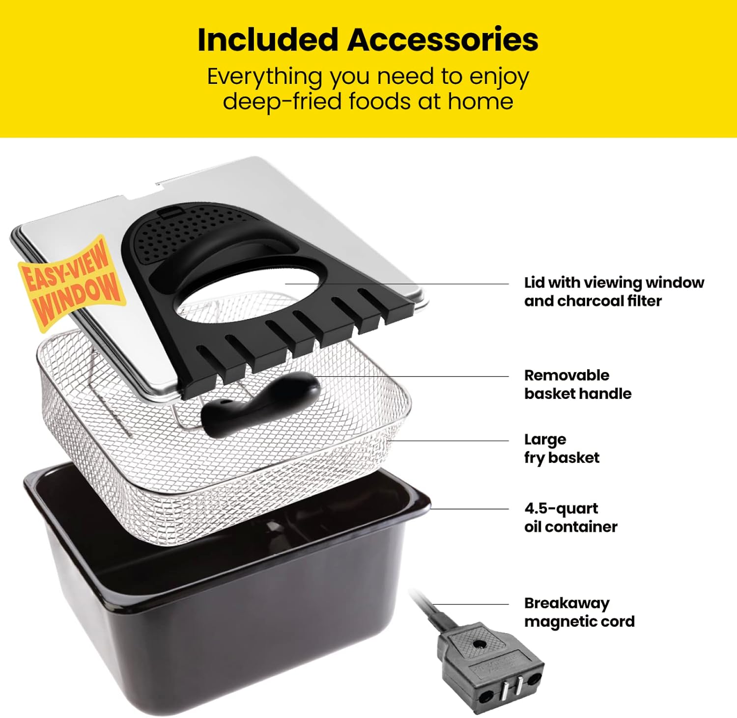 - CONVENIENT AND SAFE: Excited to see how your food is coming along. With the fryer’s lid, complete with a viewing window, you can check the crispiness of your food without opening the fryer. The magnetic breakaway cord prevents spills and accidents, so you can worry less about safety and concentrate more on what you’re cooking up