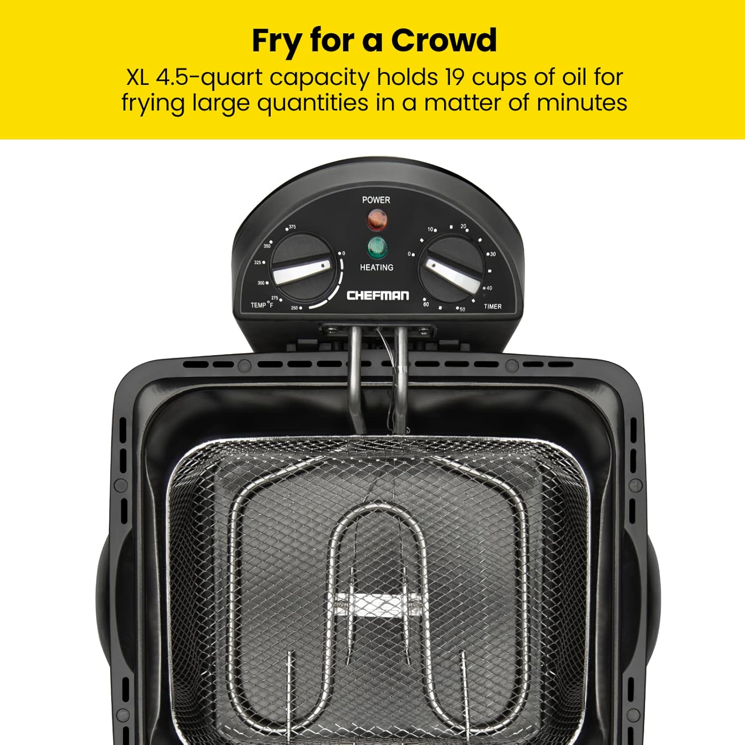 - FRY FOR THE FAMILY: Great for a hungry crowd, this fryer’s 4.5-liter capacity fries large portions of French fries, doughnuts, fried chicken, homemade chips, mozzarella sticks, and more. Throwing a party, having the holidays at your house or just have a love fried food. Make sure this fryer is a part of your cooking plans.