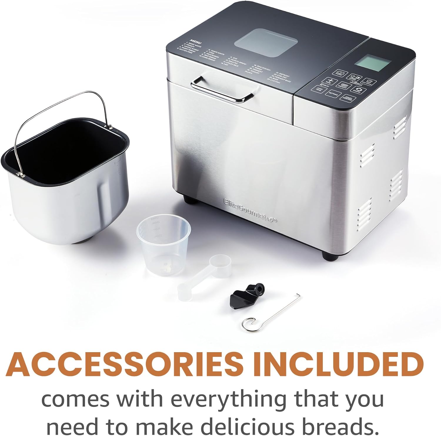 The Elite Gourmet Stainless Steel, 2 lb digital bread machine with glass top and touch panel adds elegance and precision baking to your kitchen and takes the guess work out of making preservative free homemade bread. The ceramic coated bread pan is food safe, durable and provides optimal non-stick properties. Ideal for busy chefs with 19 pre-set functions for many types of bread and flours to include: basic, quick (no yeast), sweet, French, whole wheat, rye, gluten-free, rice and sandwich breads, you can also prepare various doughs to include pizza, whole meal and leaven. Preparing a variety of delicious breads and other foods is simple: just add ingredients, select your cycle, and press start. Once you’ve enjoyed your first delicious homemade batch, you’ll be experimenting with other tasty recipes, and it won’t be long before family and friends are asking for more. Other homemade goodies include making jam, yogurt, and baking cakes. The delay function can be used to bake overnight so warm, fresh bread is ready in the morning! Select your desired crust color from light, medium dark settings. Add your favorite nuts, seeds, or dried fruits for a unique touch! Mixes and prepares dough for pizza, focaccia bread, cinnamon rolls and much more! Comes with everything you need, Bread machine base, Ceramic coated bread pan, Measuring cup, Measuring spoon, Kneading blade & blade removal hook and an Instruction manual with tips, and recipes. This is a true multi-functional appliance that saves time and money!