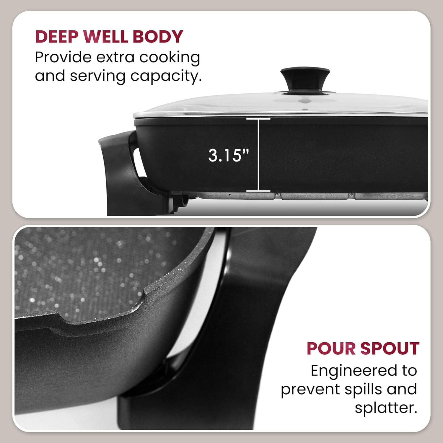 Elite Gourmet EG6203 Extra Deep 16″x13″x3.2″ (10.5Qt.) Scratch Resistant, Easy Pour Spout, Dishwasher Safe, Non-stick Electric Skillet with Vented Glass Lid, Adjustable Temperature, Black