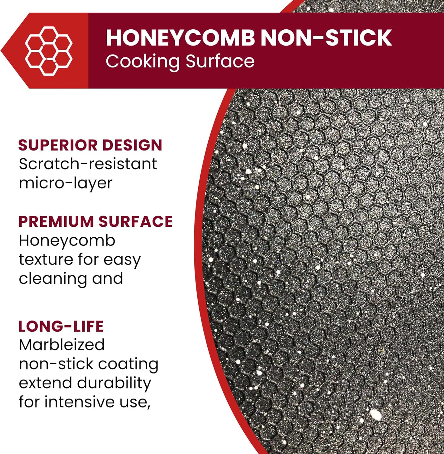 • PFOA FREE marbleized honeycomb non-stick is more durable than non-stick and will not crack or peel. It quickly releases food for a no-fuss quick and easy clean up. Scratch resistant surface allows for worry-free cooking
