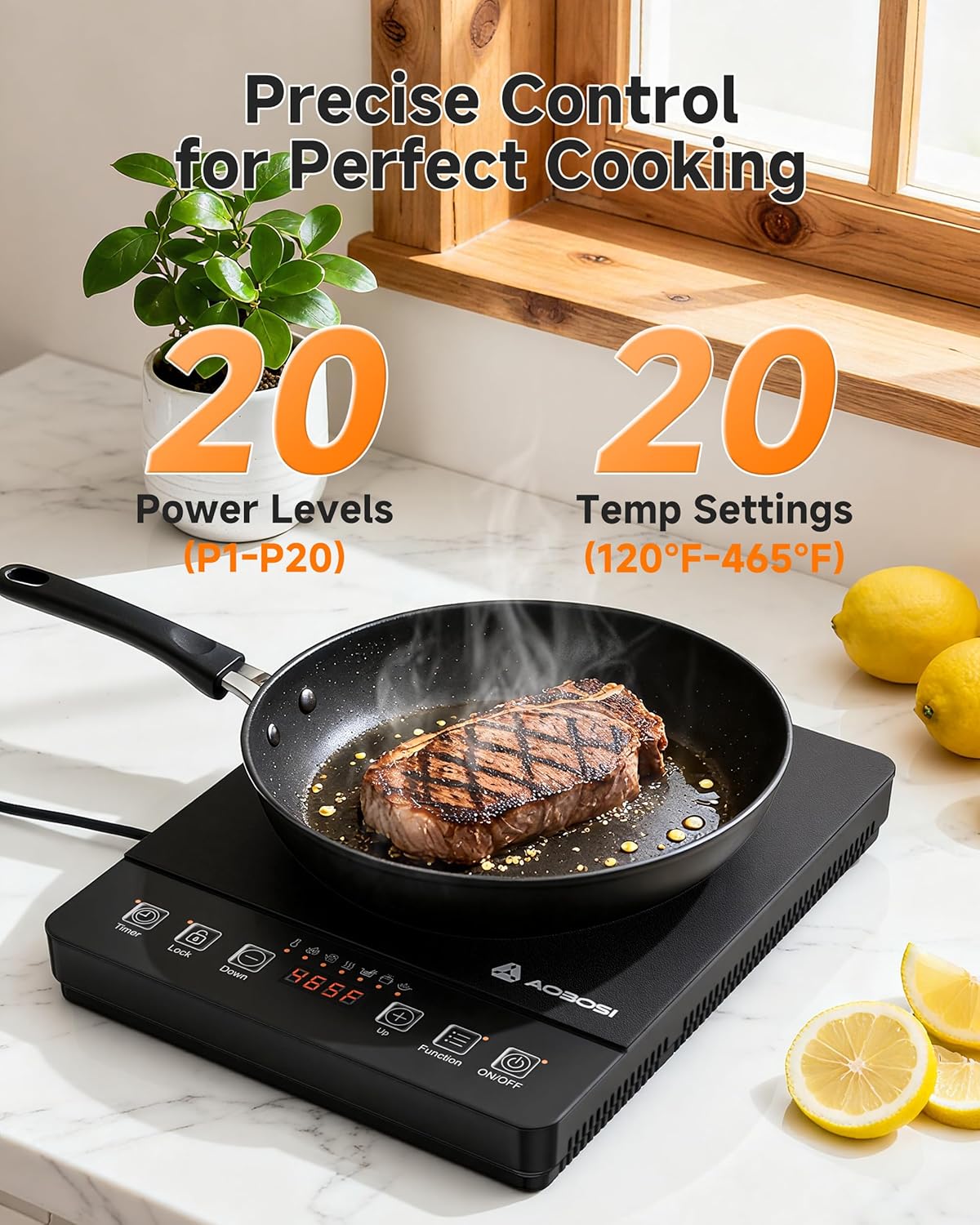 • Precise Temperature Control:Features 20 power levels (P1–P20) and 20 temperature settings from 120°F to 465°F for precise control. Easily adjust to your cooking needs—from gentle simmering to high-heat searing.