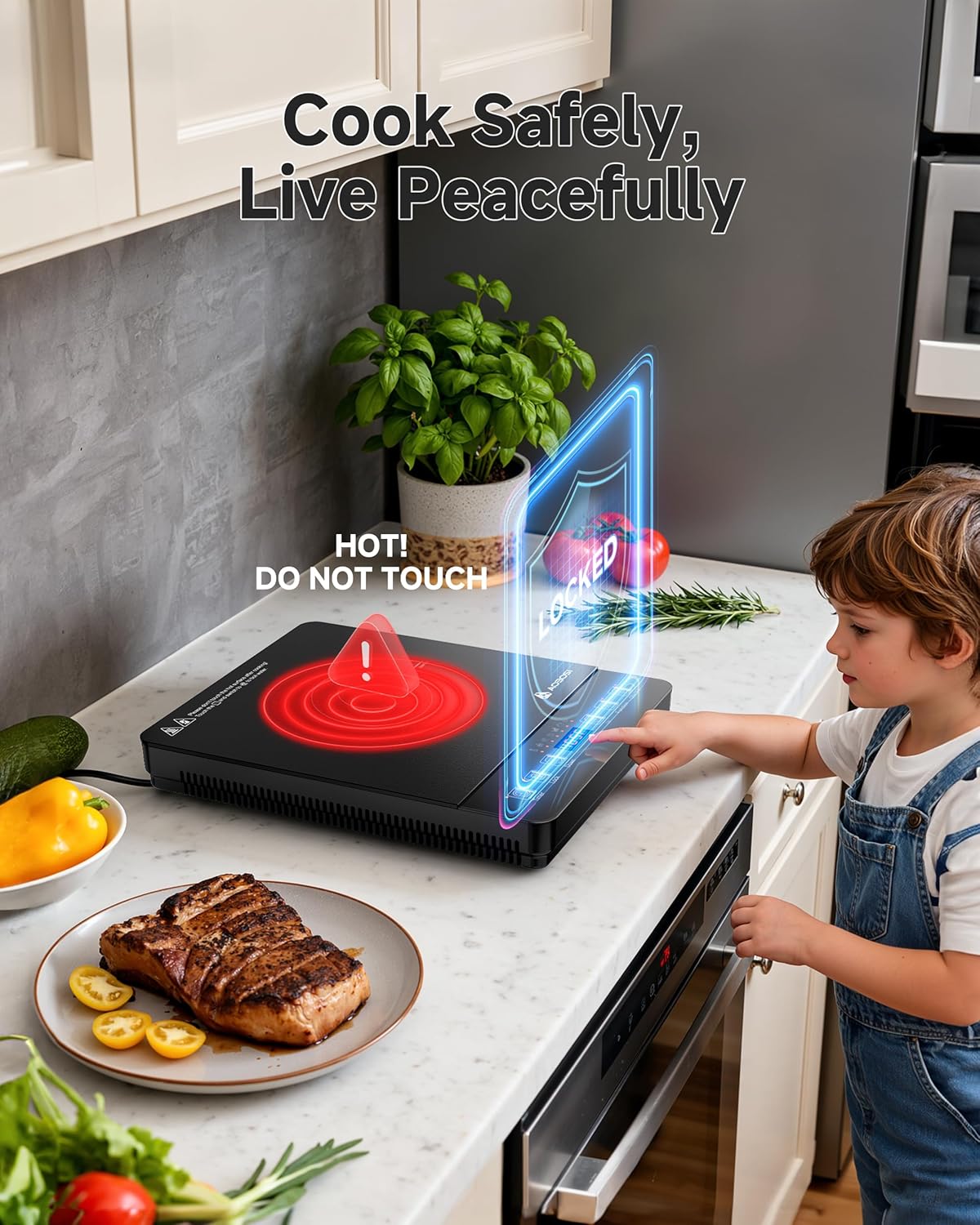 • High Efficiency & Rapid Heating:1800W induction cooktop delivers exceptional heating performance, up to 2x faster than traditional stoves. The 6.8-inch induction coil ensures even heat and consistent cooking results.